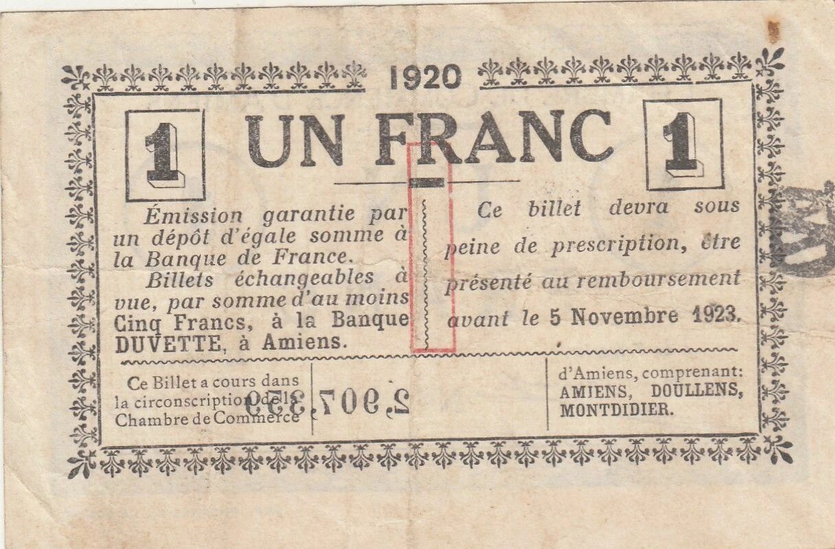 Ce billet de 1 franc a été émis par la Chambre de Commerce d'Amiens en 1920. Il s'agit d'une émission de nécessité, une pratique courante en période de crise économique ou de pénurie de monnaie.