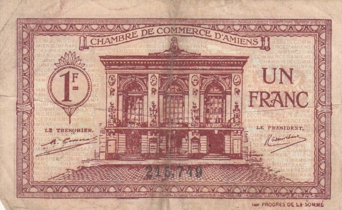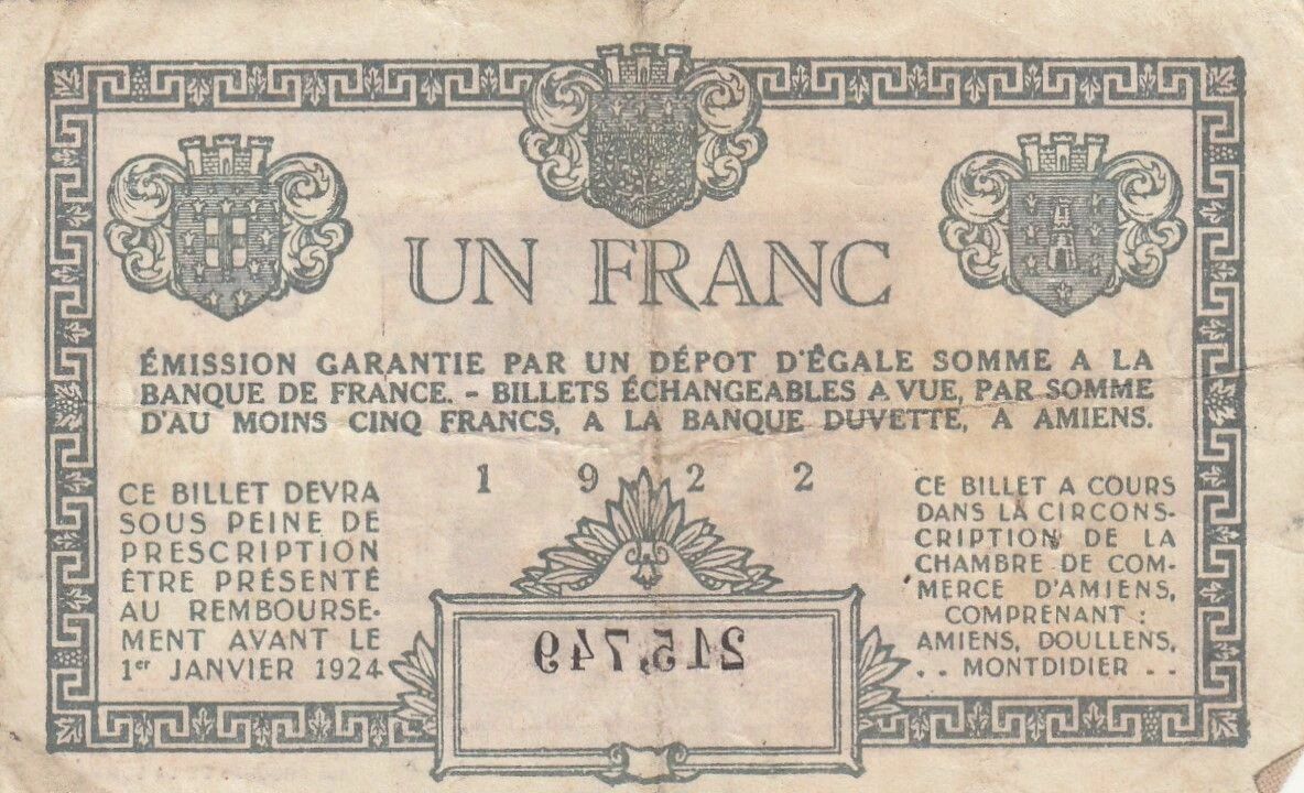 Ce billet de 1 franc a été émis par la Chambre de Commerce d'Amiens en 1922. Il s'agit d'un type de monnaie de nécessité, émis localement en période de pénurie de monnaie officielle.