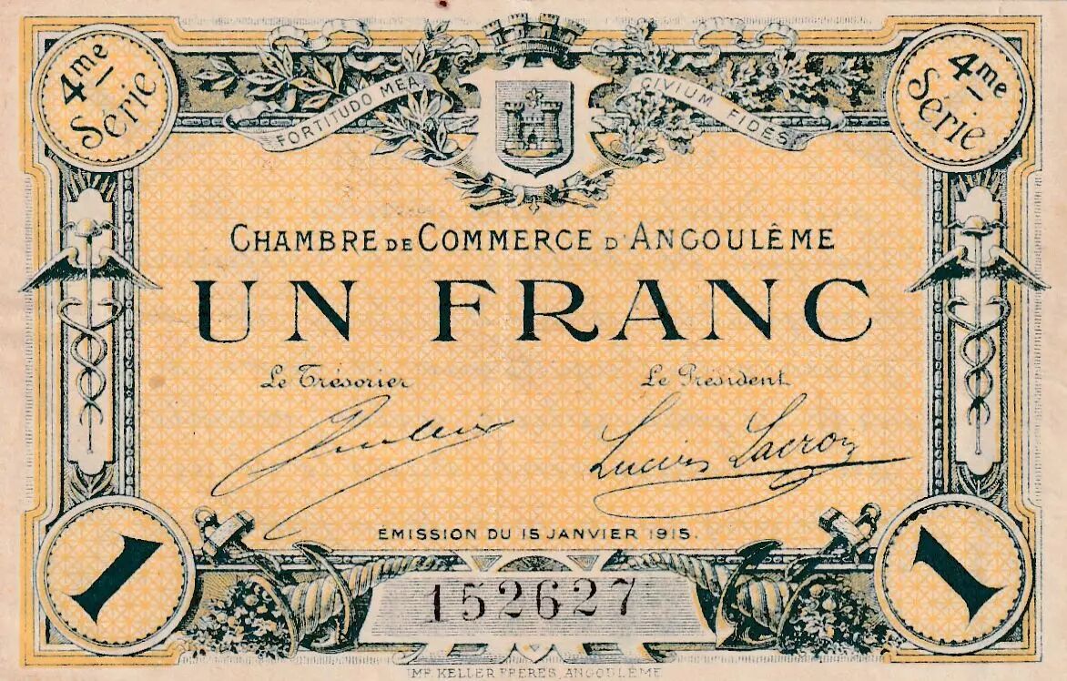 Ce billet de 1 Franc, émis par la Chambre de Commerce d'Angoulême en 1915, représente une forme de monnaie de nécessité émise en période de crise économique ou de pénurie de numéraire. Le billet appartient à la 4ème série émise par cette chambre de commerce.