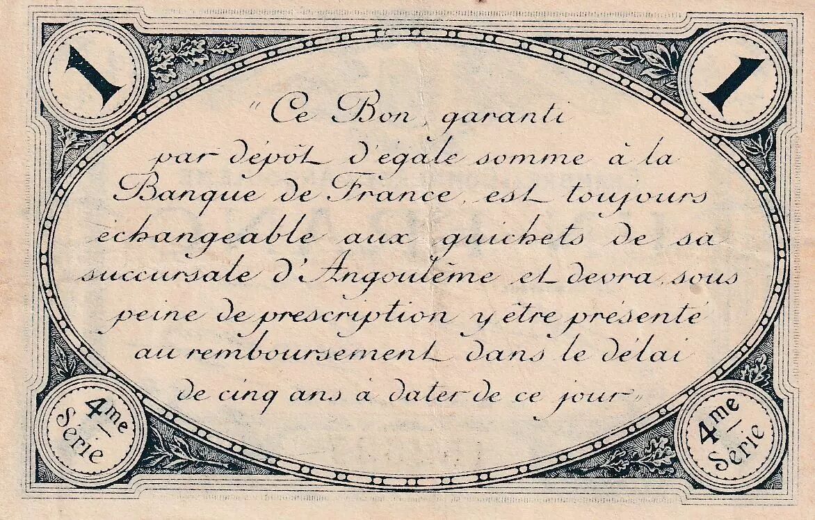 Le revers du billet porte une inscription précisant les conditions de garantie et de remboursement. Il est stipulé que le billet est garanti par un dépôt d'une somme équivalente à la Banque de France. Il est échangeable aux guichets de la succursale d'Angoulême de la Banque de France. Une clause importante mentionne que le billet doit être présenté au remboursement dans un délai de cinq ans à compter de la date d'émission, sous peine de prescription. La valeur nominale "1" est répétée de chaque côté. La mention "4me série" est également présente, faisant écho à l'avers.