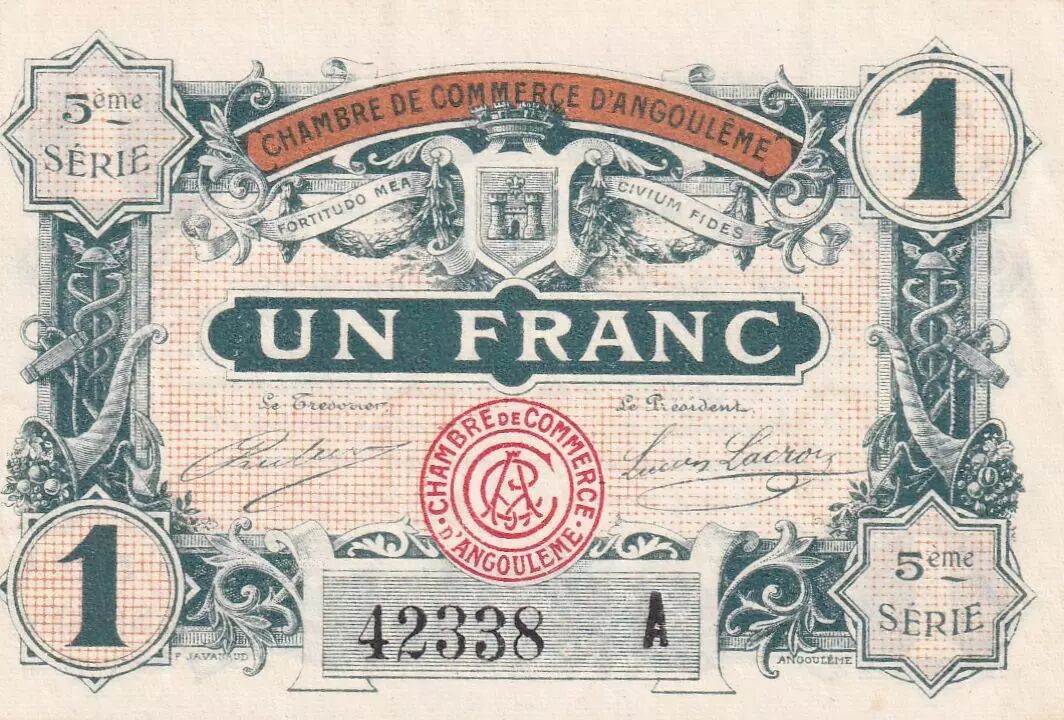 Le billet de 1 Franc émis par la Chambre de Commerce d'Angoulême en 1917 représente une forme de monnaie de nécessité émise en période de contraintes économiques. Ce type de billet a été produit pour faciliter les échanges commerciaux locaux en réponse à une pénurie de monnaie fiduciaire.