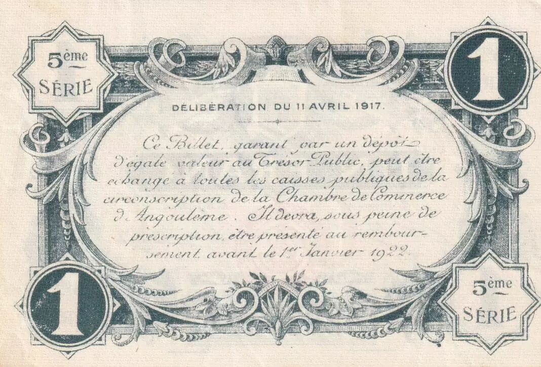 Au verso, le billet porte l'inscription "5ème série" et la valeur "1" répétés. Il contient le texte de la délibération du 11 avril 1917, qui précise que le billet est garanti par un dépôt d'égale valeur au Trésor Public. Il est échangeable dans toutes les caisses publiques de la circonscription de la Chambre de Commerce d?Angoulême et doit être présenté au remboursement avant le 1er janvier 1922, sous peine de prescription.
