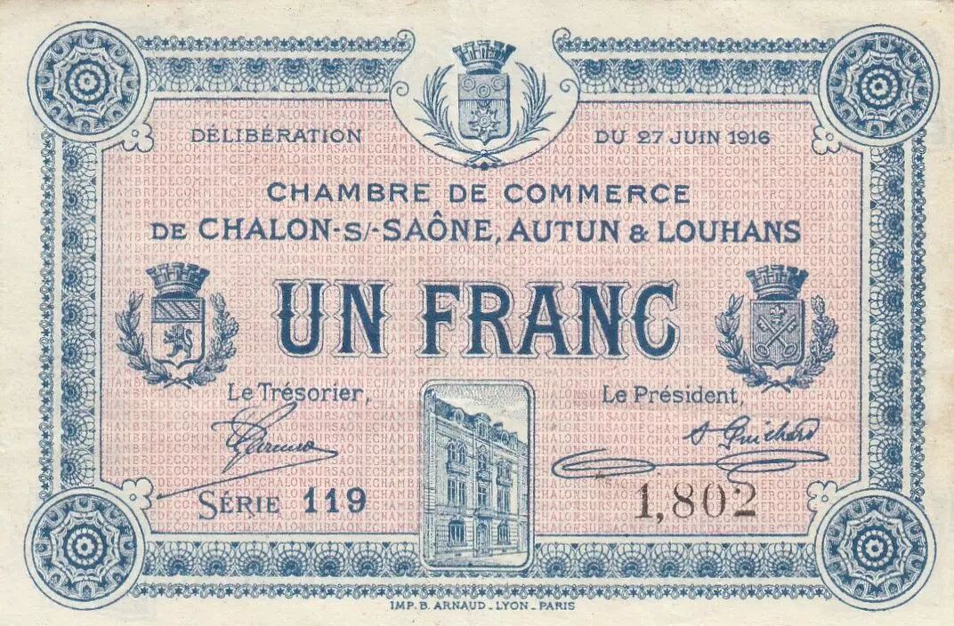 Le recto du billet présente une composition typographique simple et fonctionnelle. La valeur nominale, « 1 Franc », est clairement indiquée en chiffres et en lettres. La mention de la Chambre de Commerce d'Autun et Louhans, en tant qu'émetteur, est également bien visible. Le numéro de série du billet est imprimé en rouge, permettant l'identification unique de chaque billet au sein de la série. La date d'émission, « 27-06-1916 », est également mentionnée. Des signatures manuscrites authentifient le billet, ajoutant une dimension de contrôle et de responsabilité à son émission. Les filigranes, intégrés au papier, peuvent être présents pour renforcer la sécurité contre la contrefaçon.
