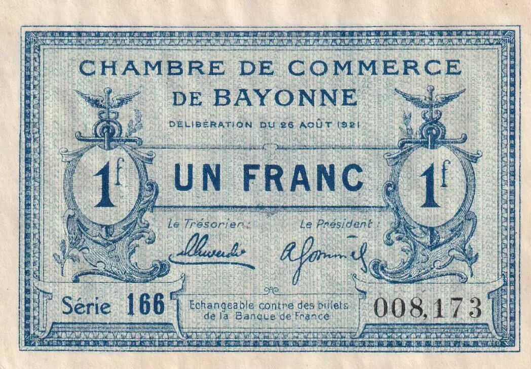 This 1 Franc banknote, issued by the Bayonne Chamber of Commerce, dates from August 26, 1921. It is part of Series 166.
