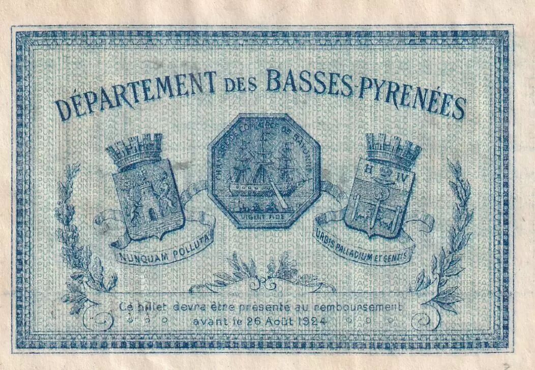 The back of the banknote bears the words "DEPARTEMENT DES BASSES-PYRENEES". An important clause specifies that this banknote had to be presented for reimbursement before August 24, 1924, indicating a deadline for its exchange.