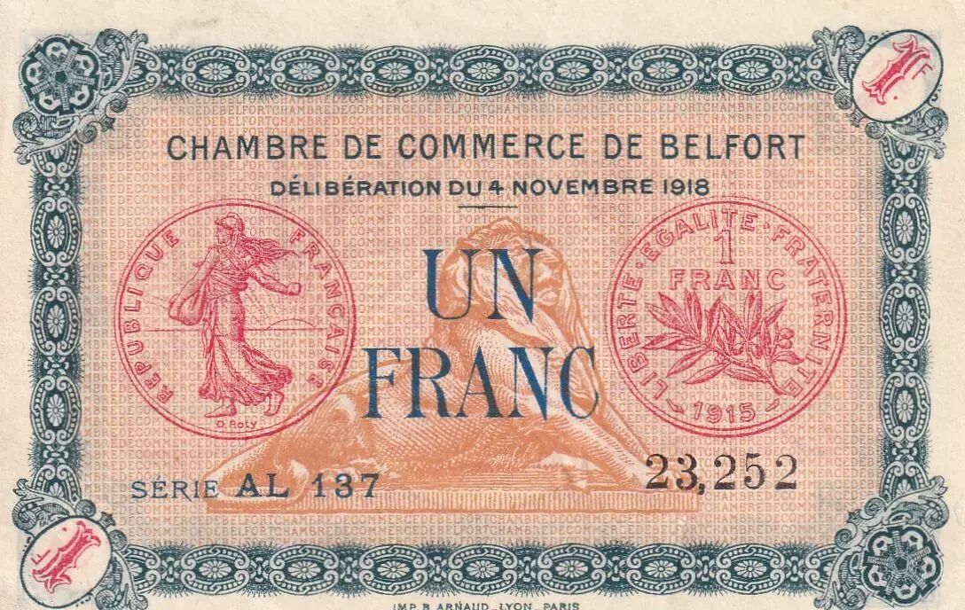 This 1 franc note was issued by the Belfort Chamber of Commerce in France, following a deliberation on November 4, 1918. It is an emergency banknote, issued in a specific economic context related to the First World War.