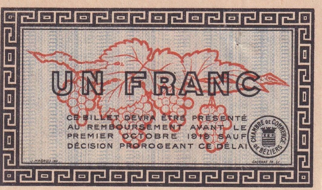 Jean Marie Joseph Magrou is credited as the designer of this banknote. The printer is Cadenat Frères, located in Béziers, France. The banknote does not have a visible watermark. The writing used on the banknote is Latin, which was common for official documents in France at that time. The specific dimensions of the banknote are not mentioned, but it is a standard size for banknotes of this period.