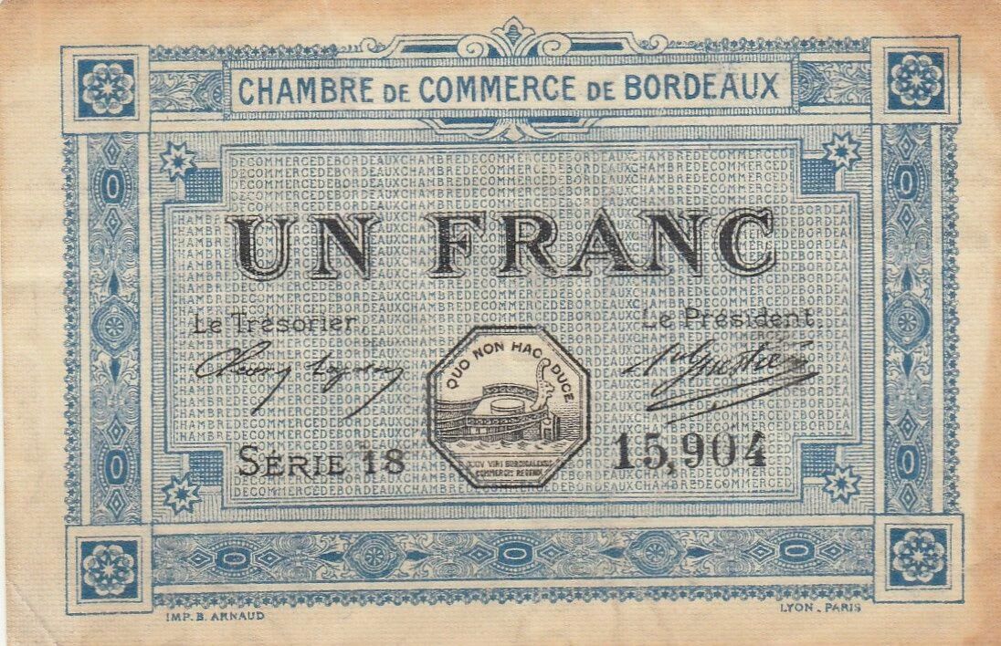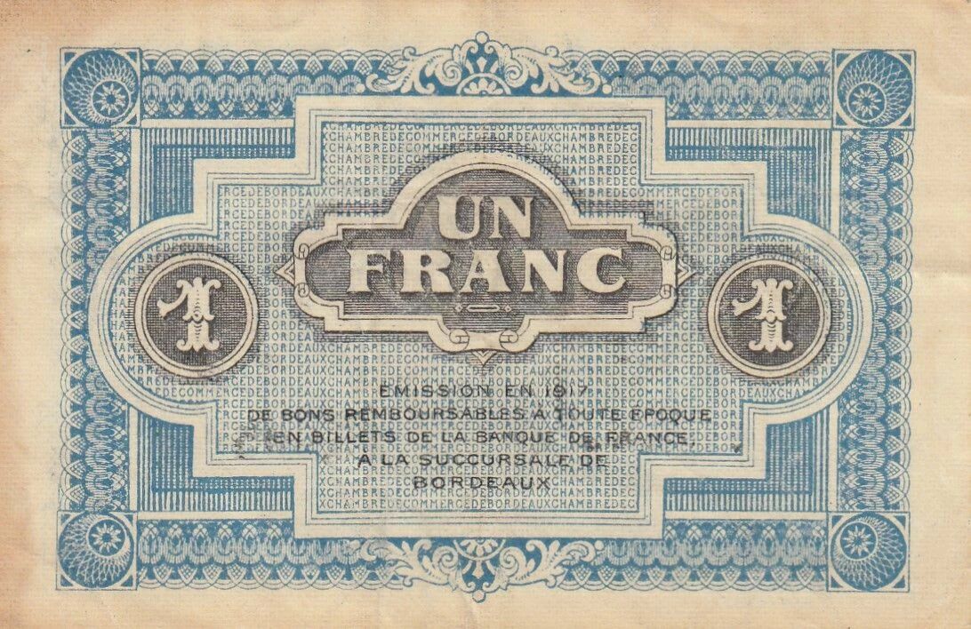 Ce billet de 1 franc a été émis par la Chambre de Commerce de Bordeaux en 1917. Il représente une forme de monnaie de nécessité, émise localement en période de pénurie de monnaie officielle durant la Première Guerre mondiale.