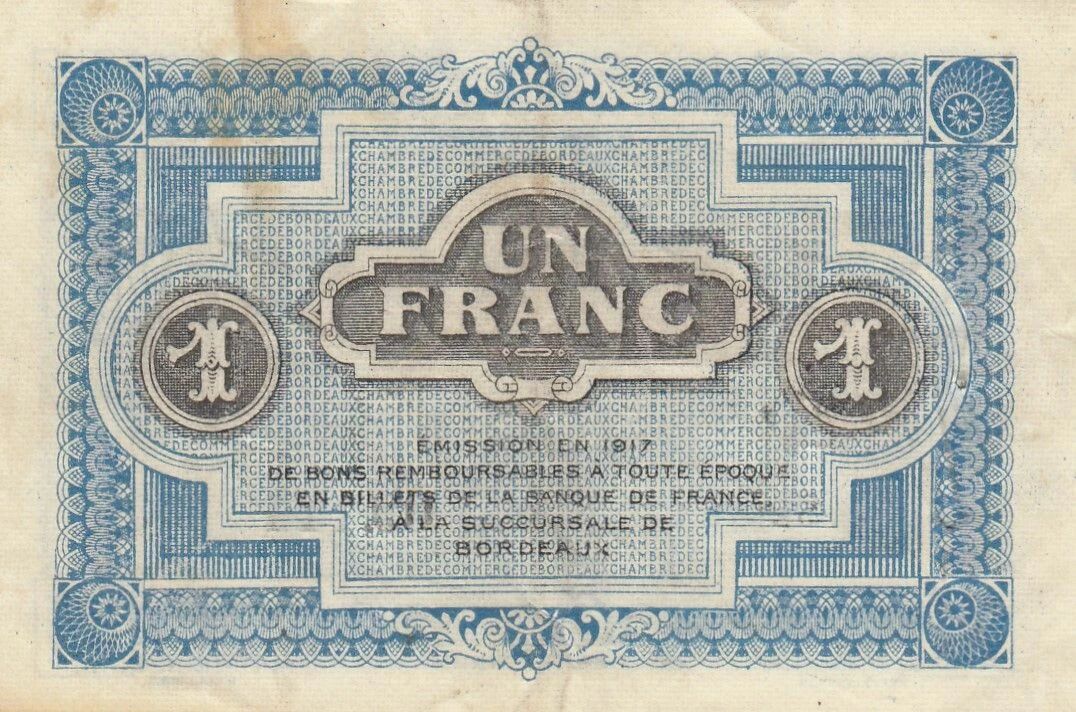 Ce billet de 1 franc a été émis par la Chambre de Commerce de Bordeaux en 1917. Il représente une forme de monnaie de nécessité, émise localement en période de pénurie de monnaie officielle durant la Première Guerre mondiale.