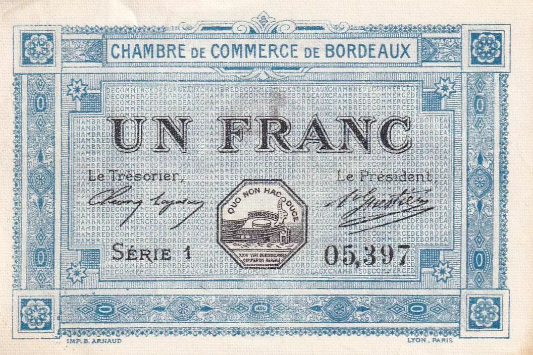 On the front, the inscription "CHAMBRE DE COMMERCE DE BORDEAUX" is clearly visible. The face value "UN FRANC" is also indicated, along with the signatures of the Treasurer and the President. A serial number, here "05.397", is printed, and the printer's mention "IMP B.ARNAUD LYON_PARIS" is also present.