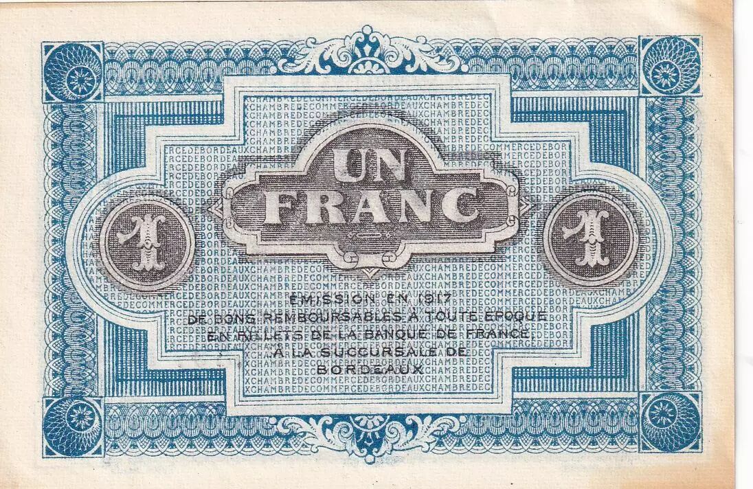 The back of the banknote displays the face value "1" as well as "UN FRANC". The inscription "EMISSION EN 1917" specifies the year of issue. An important mention indicates that "CE BON REMBOURSABLE À TOUTE ÉPOQUE EN BILLET DE LA BANQUE DE FRANCE À LA SUCCURSALE DE BORDEAUX", highlighting its convertibility into Banque de France banknotes at Bordeaux.
