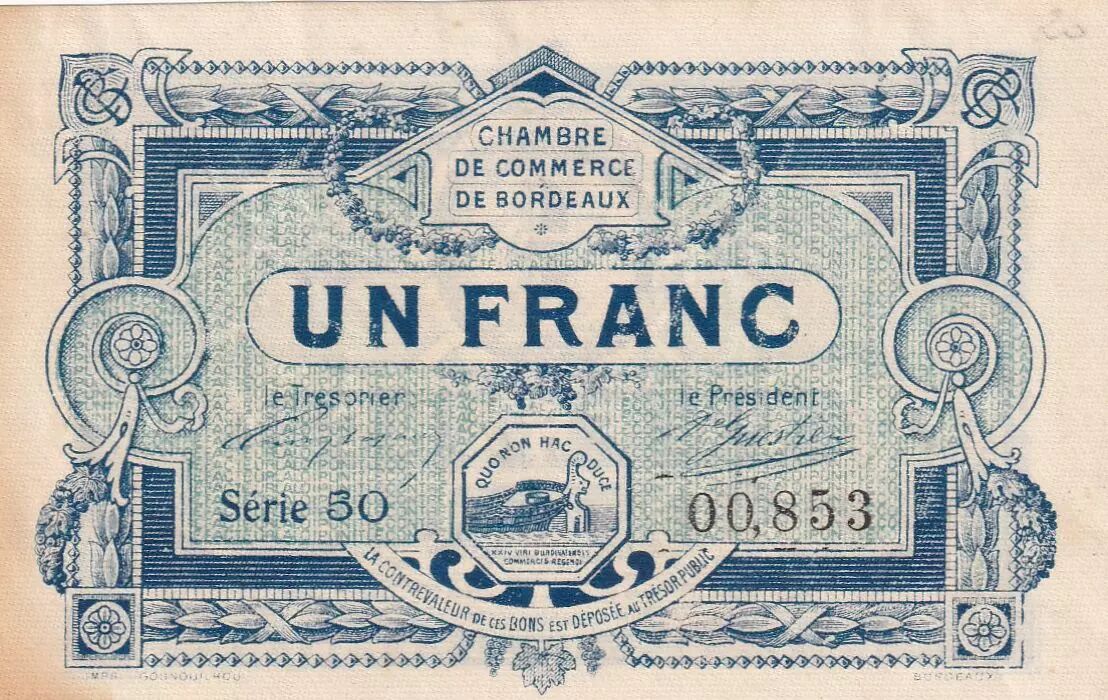 Ce billet de 1 franc a été émis par la Chambre de Commerce de Bordeaux en 1917, appartenant à la Série 50. Il est imprimé en écriture latine et comporte des inscriptions significatives sur ses deux faces.