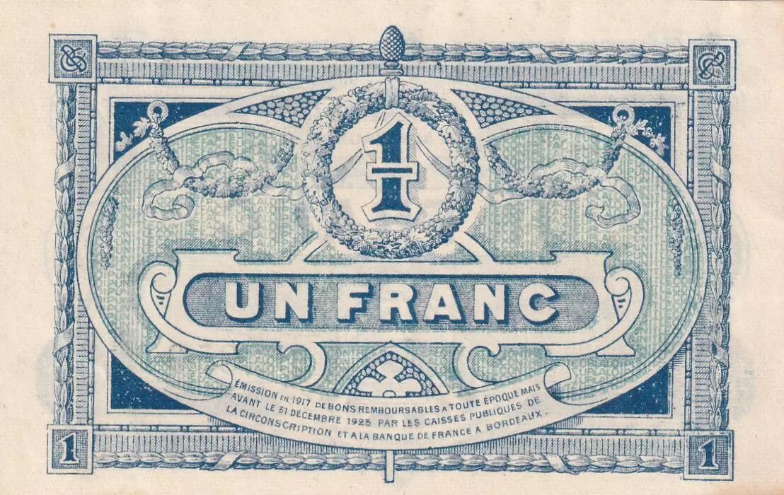 Le verso du billet affiche la valeur nominale "1" et "UN FRANC". Une inscription précise que ces bons ont été émis en 1917 et sont remboursables à toute époque, mais avant le 31 décembre 1923, par les caisses publiques de la circonscription et à la Banque de France à Bordeaux.
