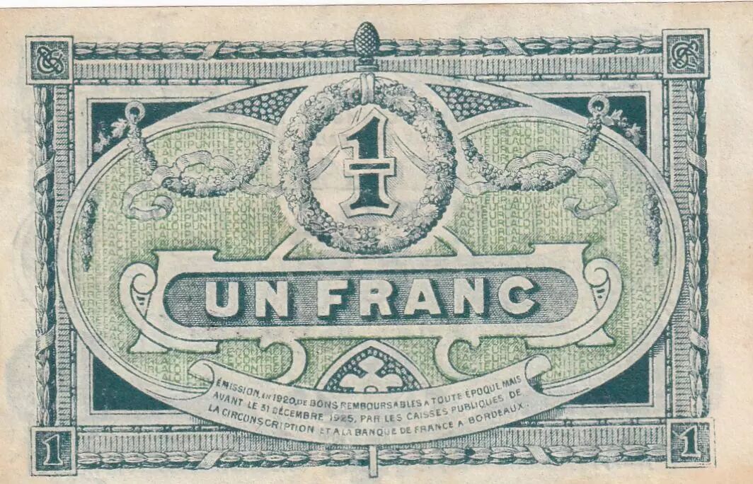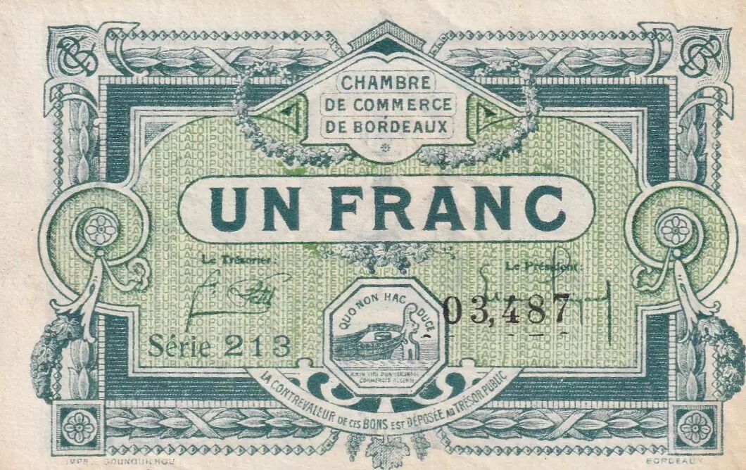 This 1 franc banknote was issued by the Bordeaux Chamber of Commerce in 1920 and belongs to Series 213. It is a redeemable voucher.