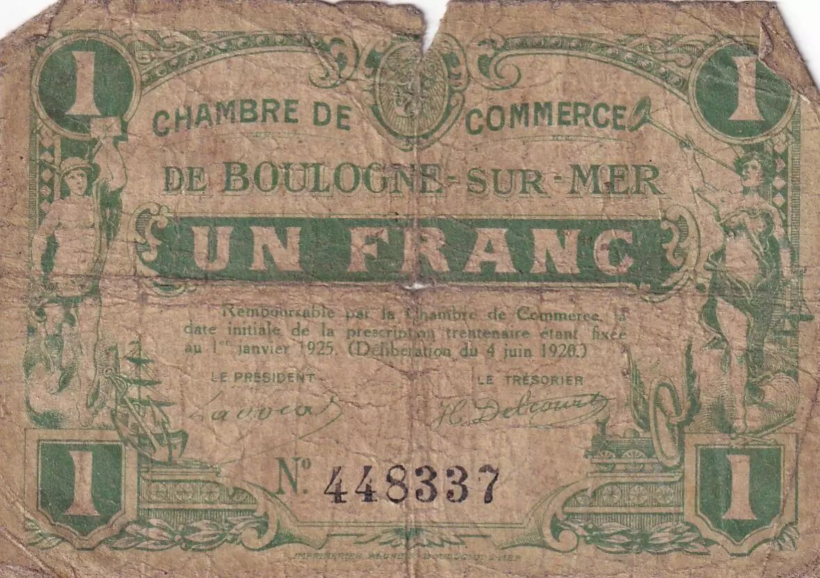The 1 Franc note issued by the Chamber of Commerce of Boulogne-sur-Mer is a testament to French local monetary history. Dating from 1914, this note was designed to be refundable by the Chamber of Commerce, with an initial thirty-year statute of limitations set for January 1, 1925, according to a deliberation of June 4, 1920.