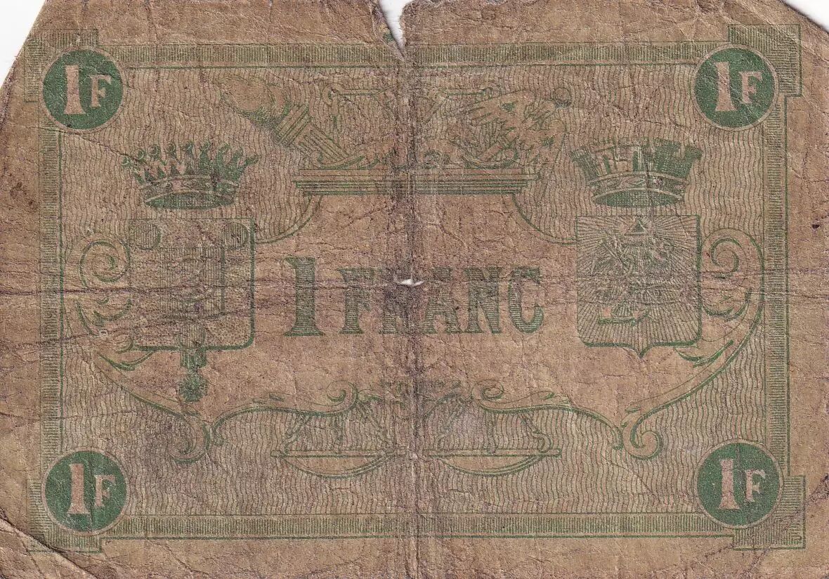 The back of the note is simpler, with the face value "1 FRANC" inscribed in capital letters. The writing used on both sides of the note is Latin, the administrative language of the time.