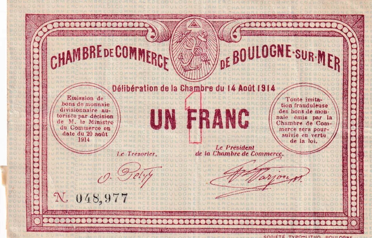 This French banknote, with a face value of 1 franc, was issued by the Chamber of Commerce of Boulogne-sur-Mer. It is dated August 14, 1914.