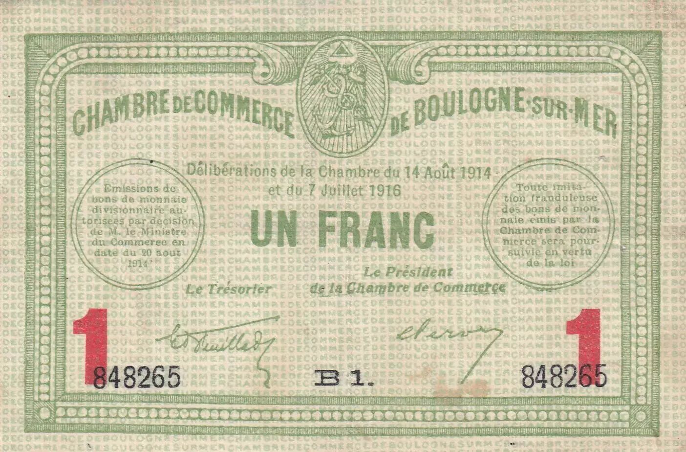 This French banknote was issued by the Chamber of Commerce of Boulogne-sur-Mer. It has a face value of one franc. The year of issue is 1914.