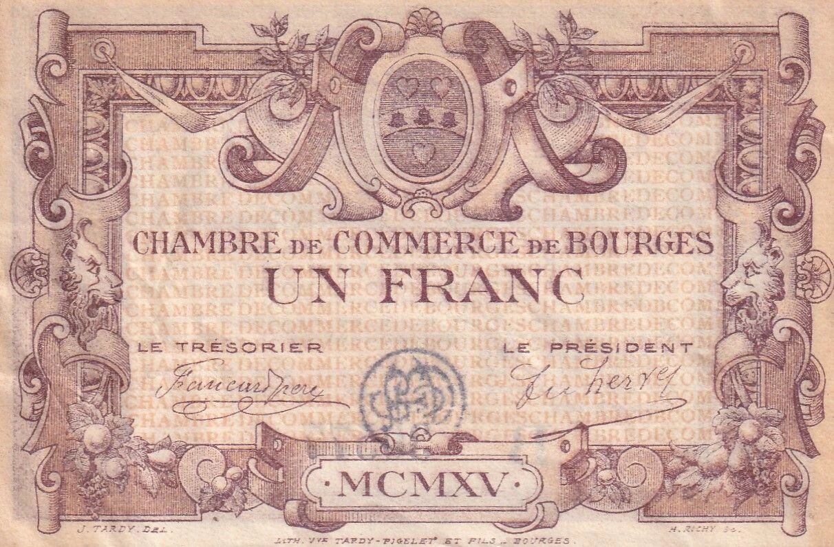 Sur le recto, on peut lire les inscriptions "CHAMBRE DE COMMERCE DE BOURGES" et "UN FRANC", accompagnées des mentions "LE TRÉSORIER" et "LE PRÉSIDENT". L'année d'émission, "M CM XV" (1915), est également indiquée. Le nom du dessinateur, J. Tardy, est présent avec la mention "J. TARDY DEL.", ainsi que l'information sur l'imprimeur "LITH. Vve TARDY - PIGELET ET FILS - BOURGES". Le nom du graveur, H. Richy, est mentionné avec "H. RICHY Sc.".