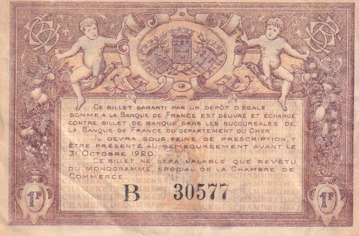 Le verso du billet contient le texte suivant : "CE BILLET GARANTI PAR DEPOT D'EGALE SOMME A LA BANQUE DE FRANCE EST DELIVRE ET ECHANGE CONTRE BILLET DE BANQUE DANS LA SUCCURSALLE DE LA BANQUE DE FRANCE DU DEPARTEMENT DU CHER." Il précise également : "IL DEVRA, SOUS PEINE DE PRECRIPTION, Y ETRE PRESENTE AU REMBOURSEMENT AVANT LE 31 OCTOBRE 1920." On y trouve aussi la mention "CE BILLET NE SEE SPECIAL DE LA CHAMBRE DE COMMERCE." Le numéro de série "B 30577" et la valeur "1F" sont imprimés sur cette face.