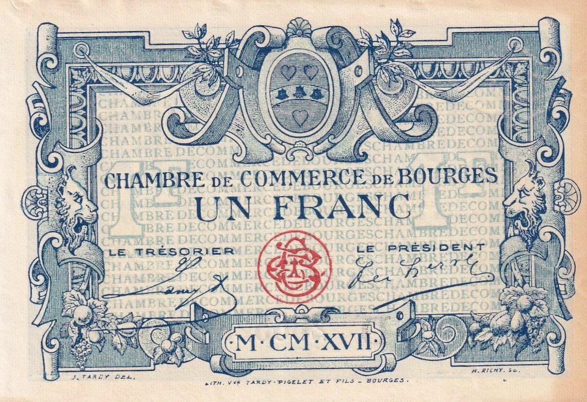 L'avers du billet porte la mention "CHAMBRE DE COMMERCE DE BOURGES" en lettres majuscules, indiquant l'institution émettrice. La valeur nominale, "UN FRANC", est clairement affichée. Les signatures du trésorier et du président de la Chambre de Commerce sont présentes, authentifiant le billet. La date d'émission, "M CM VXII" (1917), est également inscrite. Le nom du dessinateur, J. Tardy, ainsi que celui du graveur, H. Richy, sont mentionnés, reconnaissant leur contribution artistique. L'imprimerie Vve TARDY - PIGELET ET FILS - BOURGES est également nommée.