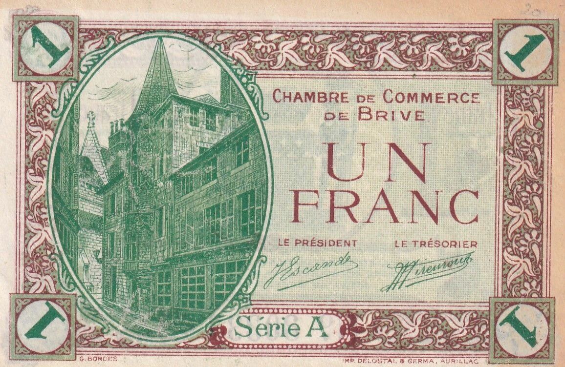 Le recto du billet présente l'inscription "CHAMBRE DE COMMERCE DE BRIVE" en lettres capitales, suivie de la valeur nominale "UN FRANC". Les signatures du Président et du Trésorier de la Chambre de Commerce sont apposées, attestant de la validité du billet. La mention "Série A" indique la série d'émission. Le nom de l'imprimeur, "G. BORDES IMP DELOSTAL & GERMA AURILLAC", figure également sur le recto, précisant l'origine géographique de l'impression.