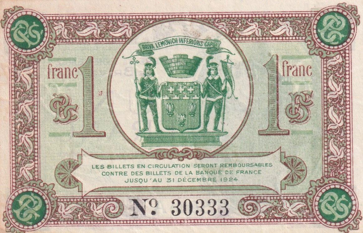 Ce billet de 1 Franc, émis par la Chambre de Commerce de Brive en 1919, représente une forme de monnaie locale émise en période de crise économique après la Première Guerre mondiale. Ces billets étaient conçus pour faciliter les transactions commerciales en palliant le manque de monnaie fiduciaire.