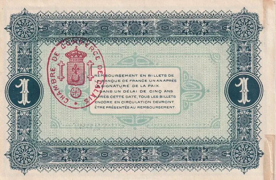 Le verso du billet précise les modalités de remboursement. Il est stipulé que le remboursement se fera en billets de la Banque de France, un an après la signature de la paix. Un délai de cinq ans après cette date est accordé pour la présentation des billets encore en circulation, qui devront être soumis au remboursement. La mention "CHAMBRE DE COMMERCE DE CALAIS" réapparaît également au verso.