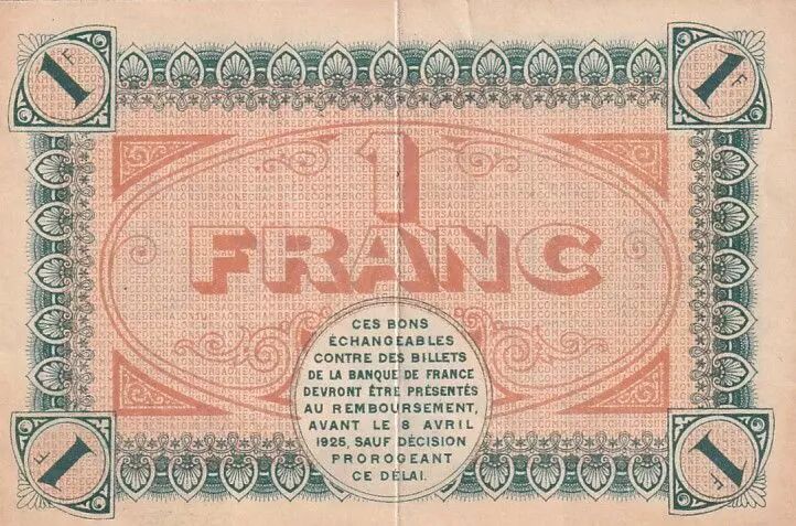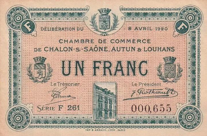 This French banknote with a face value of one franc was issued by the Chamber of Commerce of Chalon-sur-Saône, Autun and Louhans. It is dated April 8, 1920 and belongs to series F 261. The banknote is a testament to the local French economic history of the early 20th century.