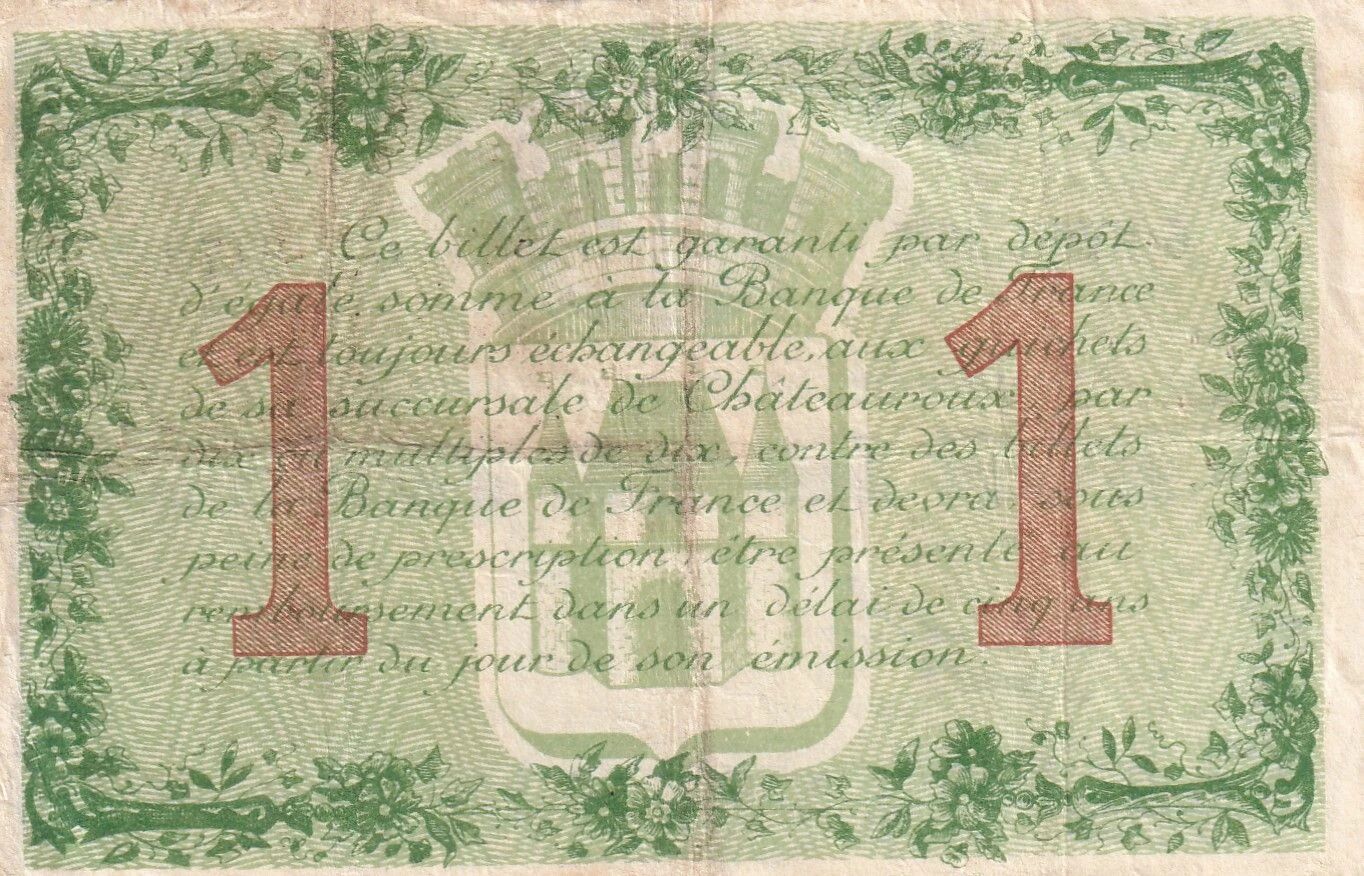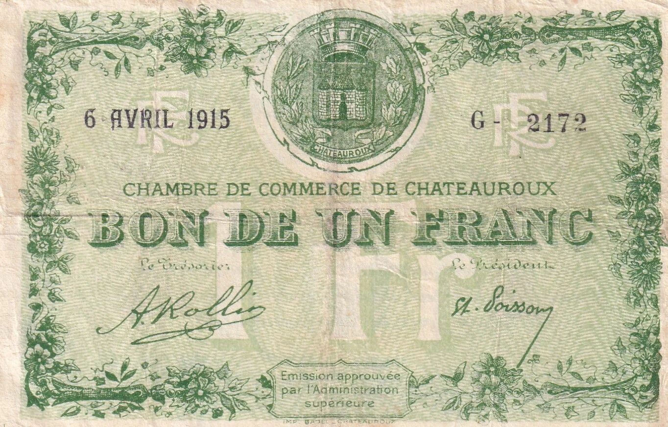 Ce billet de banque est une émission de la Chambre de Commerce de Châteauroux, datant du 6 avril 1915. Il s'agit d'un bon d'une valeur d'un franc. Le recto du billet présente l'inscription "CHAMBRE DE COMMERCE DE CHATEAUROUX" en lettres capitales, soulignant l'entité émettrice. La valeur nominale, "BON DE UN FRANC", est également mentionnée de manière proéminente. Les signatures du Trésorier et du Président sont apposées, témoignant de l'approbation interne de l'émission. Une mention indique que l'émission a été approuvée par l'Administration supérieure, assurant ainsi de sa légitimité. Le numéro de série "G- 2172" est imprimé sur le billet, servant à l'identification unique de chaque exemplaire. Le nom de l'imprimeur, "IMP BADEL CHATEAUROUX", figure également au recto, identifiant l'entreprise responsable de l'impression du billet.