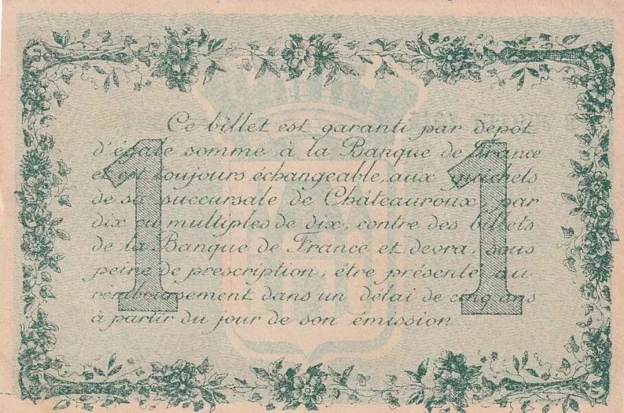Ce billet de banque français, d'une valeur nominale de un franc, a été émis en 1915 par la Chambre de Commerce de Châteauroux. Il s'agit d'un bon, un type de monnaie de nécessité émis localement en période de crise ou de pénurie de monnaie officielle.