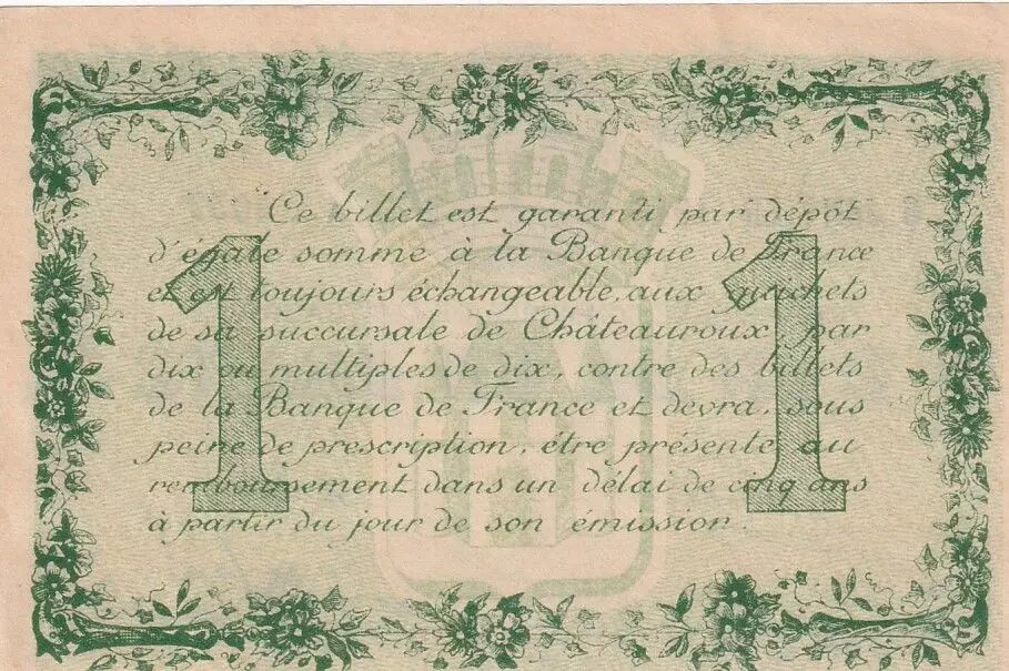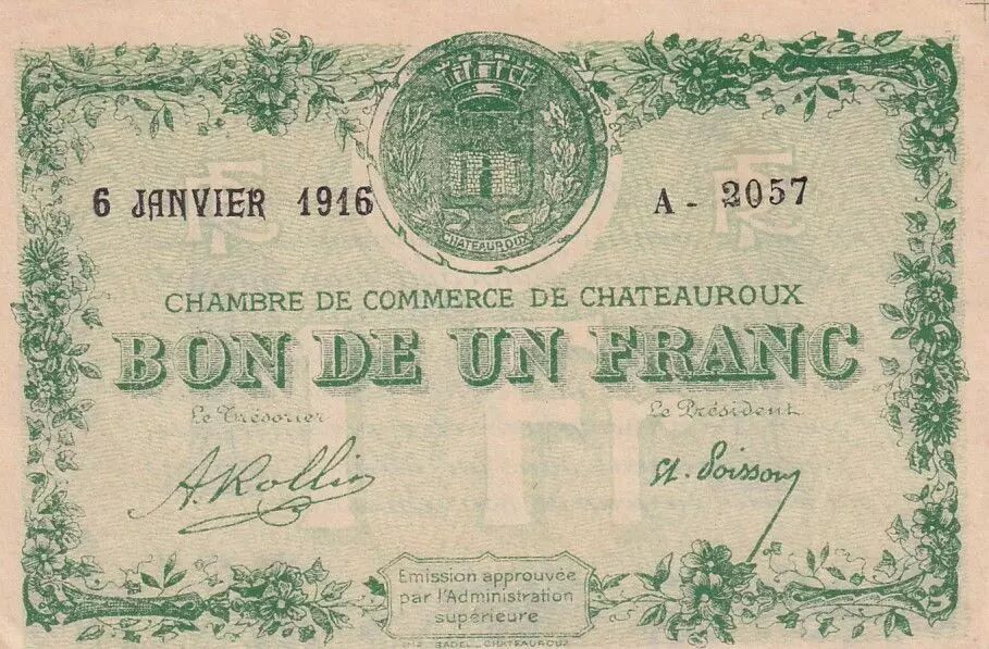 Le billet de 1 Franc émis par la Chambre de Commerce de Châteauroux date du 6 janvier 1916. Ce type de billet était une réponse à la pénurie de monnaie divisionnaire durant la Première Guerre mondiale.