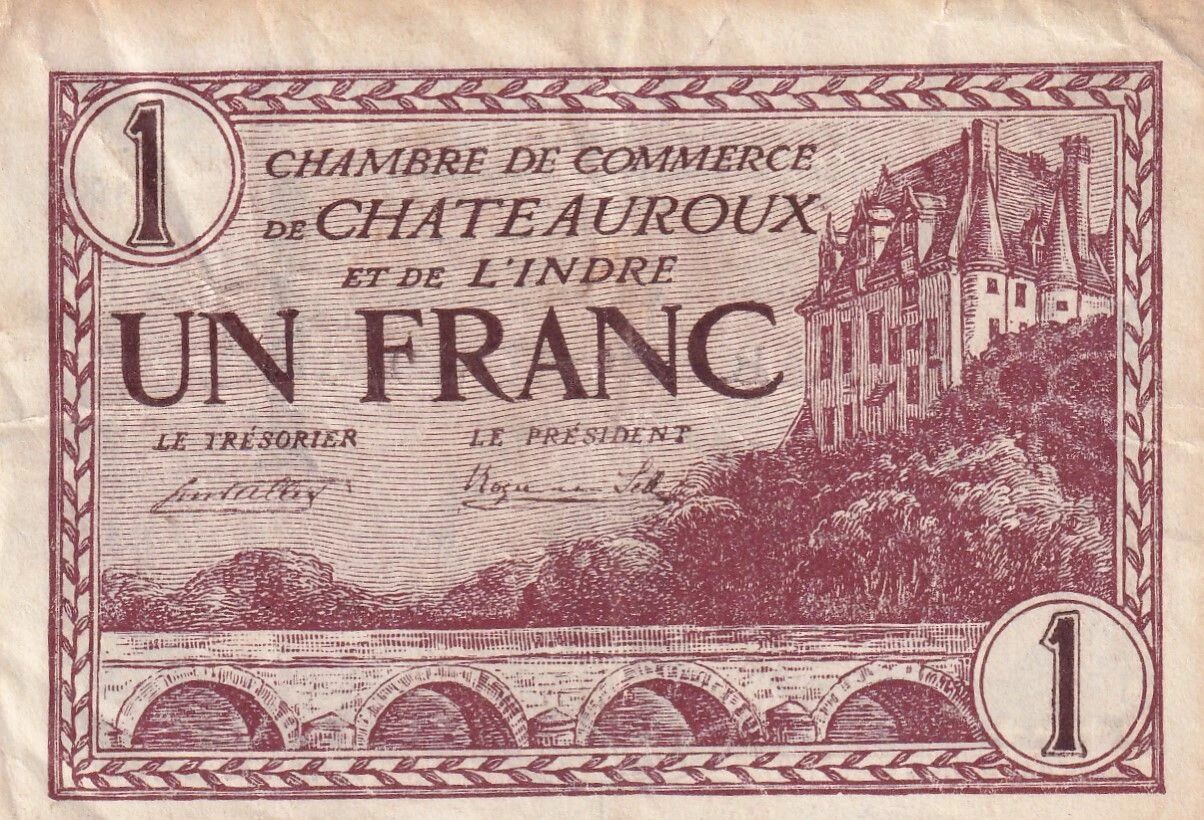 Ce billet de 1 franc a été émis par la Chambre de Commerce de Châteauroux et de l'Indre en 1922. Il appartient à la Série B et porte le numéro 01.819. Le recto du billet présente les inscriptions "CHAMBRE DE COMMERCE DE CHATEAUROUX et de L'INDRE" en lettres capitales, suivies de la mention de la valeur nominale "UN FRANC". Les signatures du Trésorier et du Président complètent cette face.