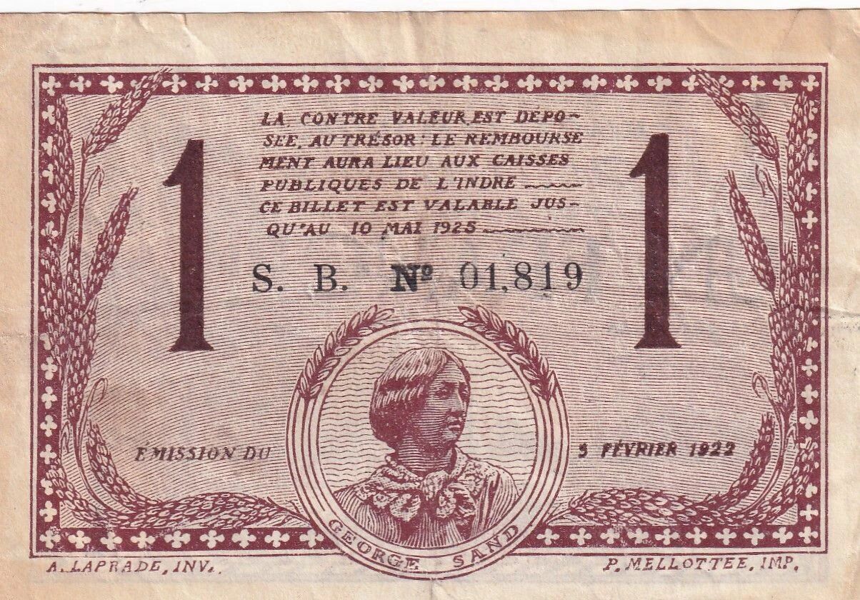 Au verso, on trouve un médaillon représentant George Sand, figure littéraire française. Les inscriptions spécifient que la contre-valeur du billet est déposée au Trésor et que le remboursement sera effectué aux caisses publiques de l'Indre. La date de validité du billet est précisée comme étant le 10 mai 1925. On y lit également "S. B." ainsi que la date d'émission du 3 février 1922. Les noms de A. LAPRADE, INV, et P. MELLOTTEE, IMP., sont également présents, indiquant respectivement le dessinateur et l'imprimeur.