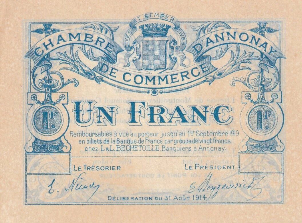 Le bon de 1 franc de la Chambre de Commerce d?Annonay daté du 31 août 1914 appartient aux projets de monnaies de nécessité non émis élaborés dans les tout premiers jours de la Première Guerre mondiale. Dès août 1914, la disparition brutale de la monnaie divisionnaire pousse de nombreuses villes à préparer des émissions locales en urgence.