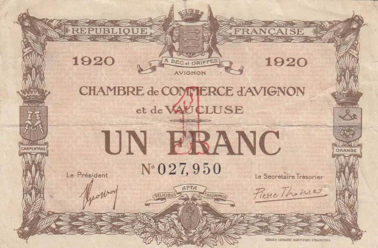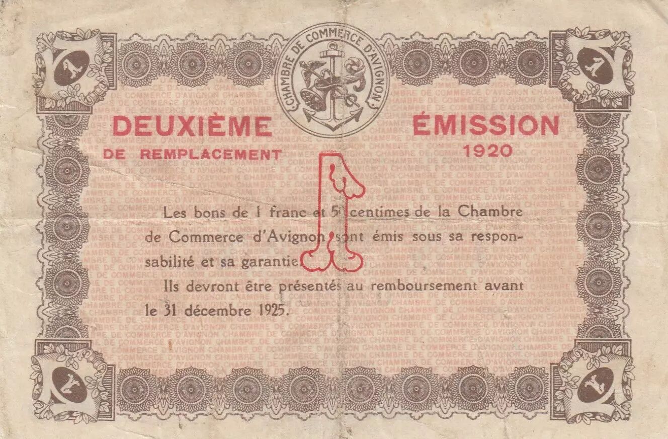Le billet de 1 Franc émis par la Chambre de Commerce d'Avignon en 1920 est un témoignage de l'histoire monétaire française. Ce type de billet, émis localement par les Chambres de Commerce, a circulé en France durant une période où les ressources monétaires nationales étaient limitées, notamment après la Première Guerre mondiale. Ces émissions locales permettaient de faciliter les transactions économiques au niveau régional.