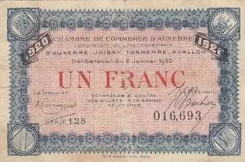 Billet France 1 franc - Chambre de commerce de Auxerre - Série 125 - 1920