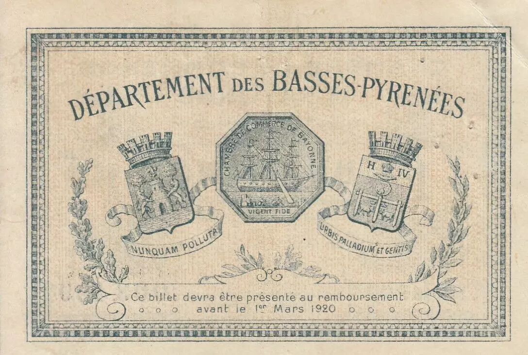 Ce type de billet a été émis dans un contexte économique particulier, probablement en raison de la nécessité de pallier une pénurie de monnaie métallique durant la Première Guerre mondiale. Les Chambres de Commerce locales ont ainsi été autorisées à émettre des billets de nécessité pour faciliter les transactions commerciales. La Série PPP permet d'identifier un tirage spécifique au sein de l'ensemble des billets émis par la Chambre de Commerce de Bayonne.