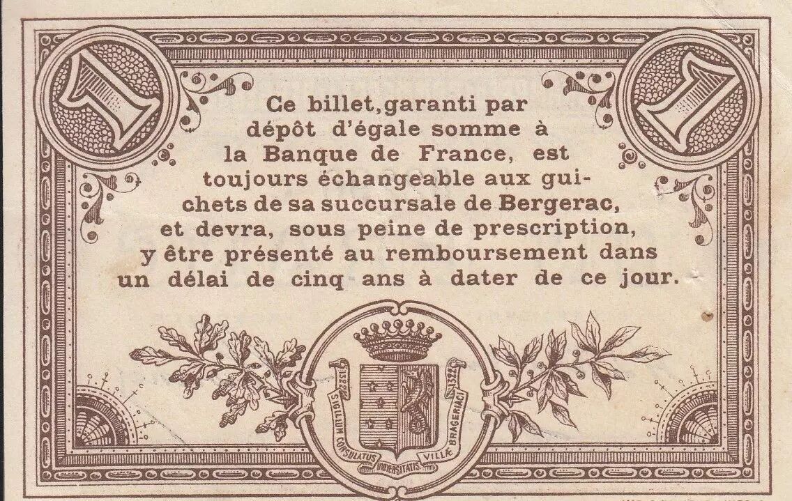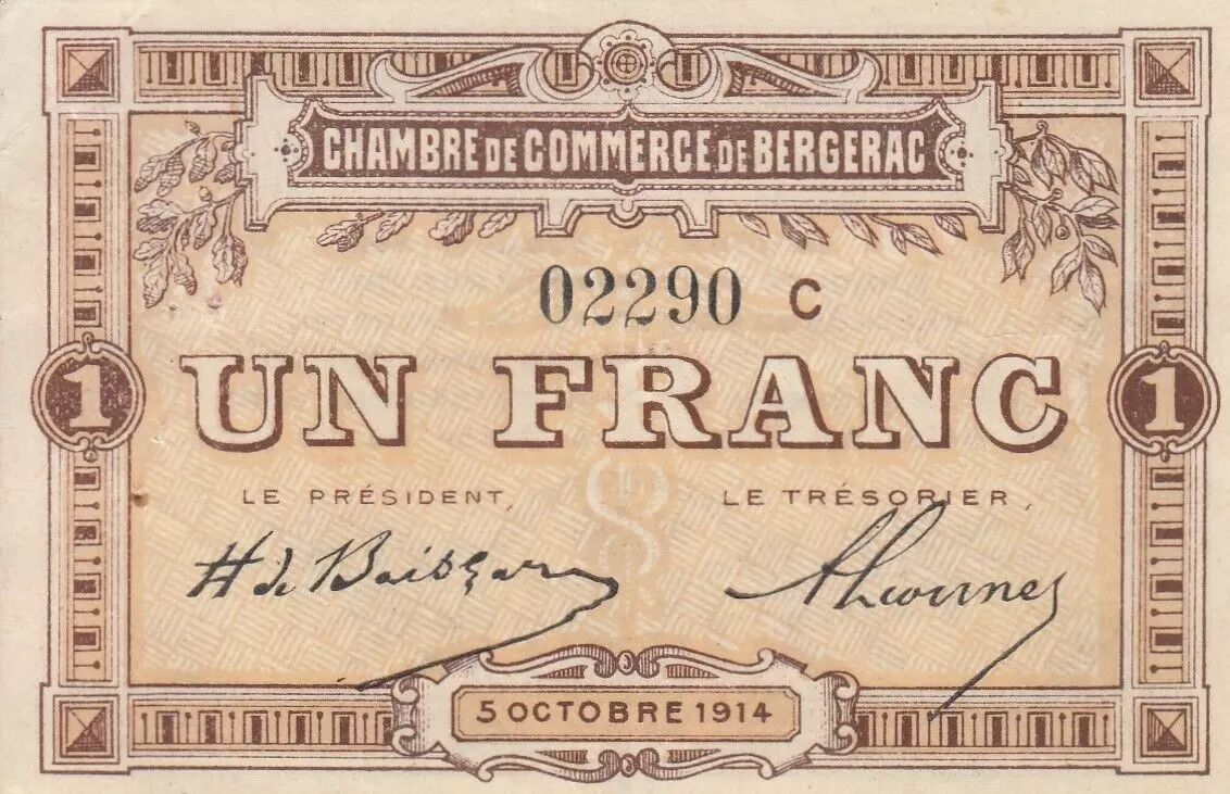 Ce billet de 1 Franc a été émis par la Chambre de Commerce de Bergerac le 5 octobre 1914. Il appartient à la Série C.