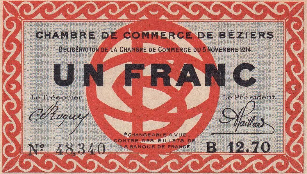 Billet France 1 Franc - Chambre de commerce de Béziers - 1914 - Série B 12.70 - P.27-8