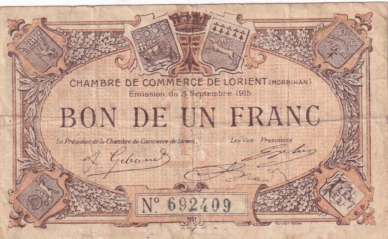 This 1 Franc banknote was issued by the Chamber of Commerce of Lorient, in the Morbihan department, on September 3, 1915. It is a voucher for a value of one franc.