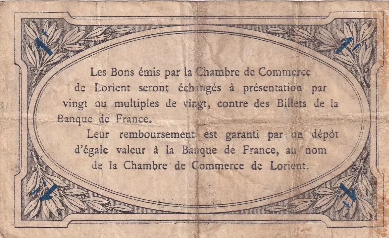 The back of the banknote features a frame decorated with floral patterns. The inscription specifies that the vouchers issued by the Chamber of Commerce of Lorient are exchangeable for banknotes of the Bank of France in multiples of twenty. It is also indicated that the reimbursement of these vouchers is guaranteed by a deposit of equal value at the Bank of France, in the name of the Chamber of Commerce of Lorient.