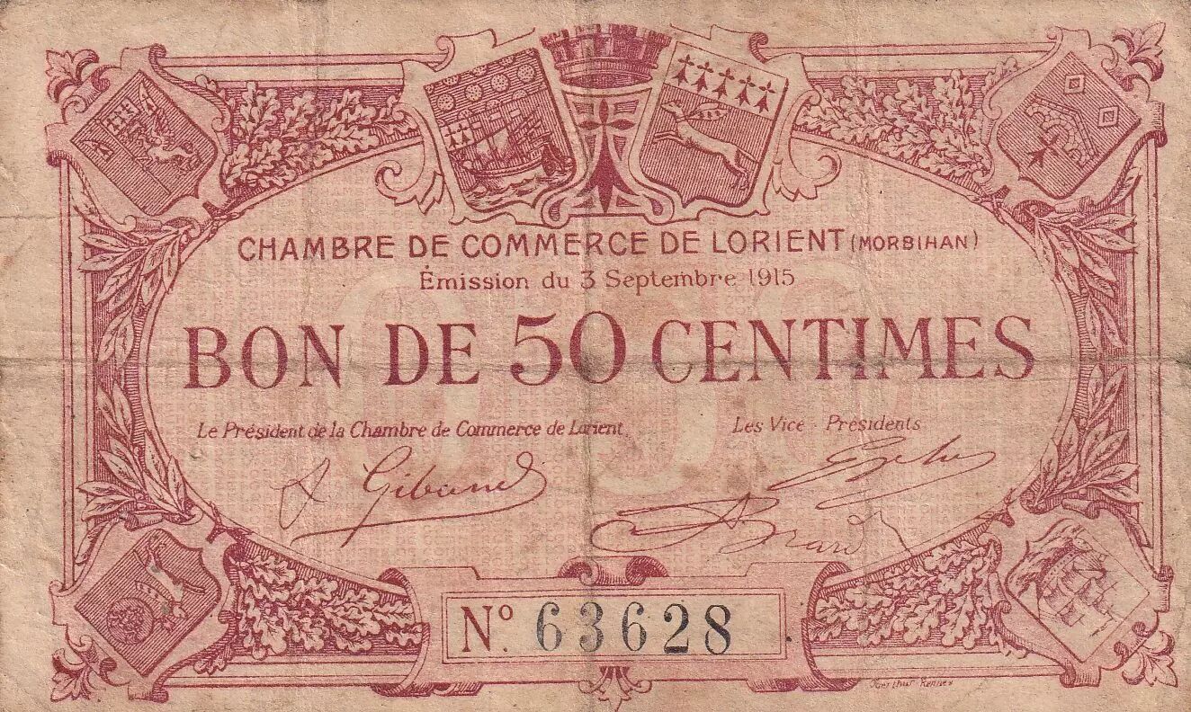 This 50 centime banknote was issued by the Chamber of Commerce of Lorient (Morbihan) on September 3, 1915. It is a voucher, with the serial number 63628.