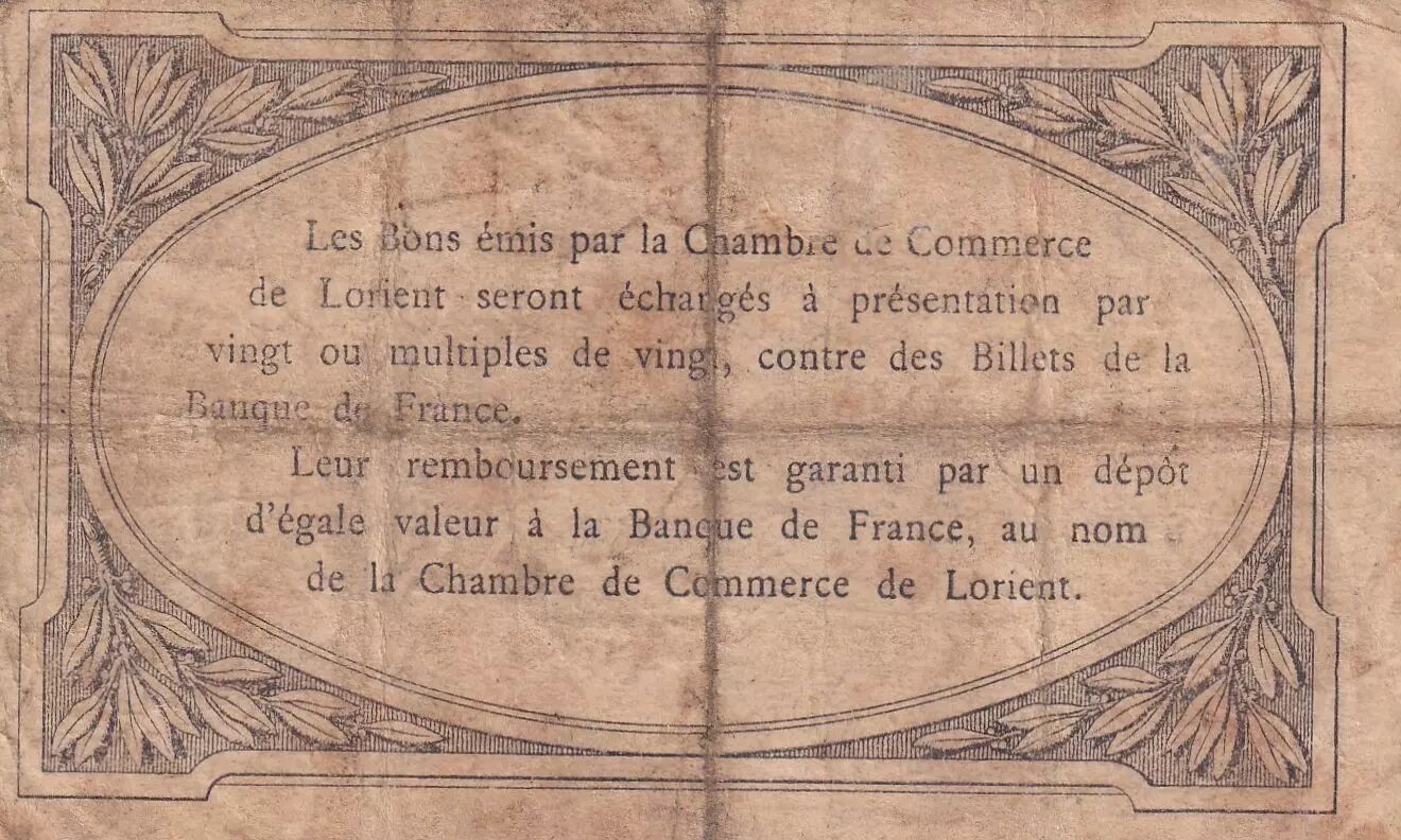 The back of the banknote features a central oval inside a frame decorated with plant motifs. The nominal value "0.50f" is repeated four times around the oval. A text specifies that the vouchers issued by the Chamber of Commerce of Lorient will be exchanged for banknotes of the Bank of France in lots of twenty or multiples of twenty. It also indicates that their reimbursement is guaranteed by a deposit of equal value at the Bank of France, in the name of the Chamber of Commerce of Lorient.