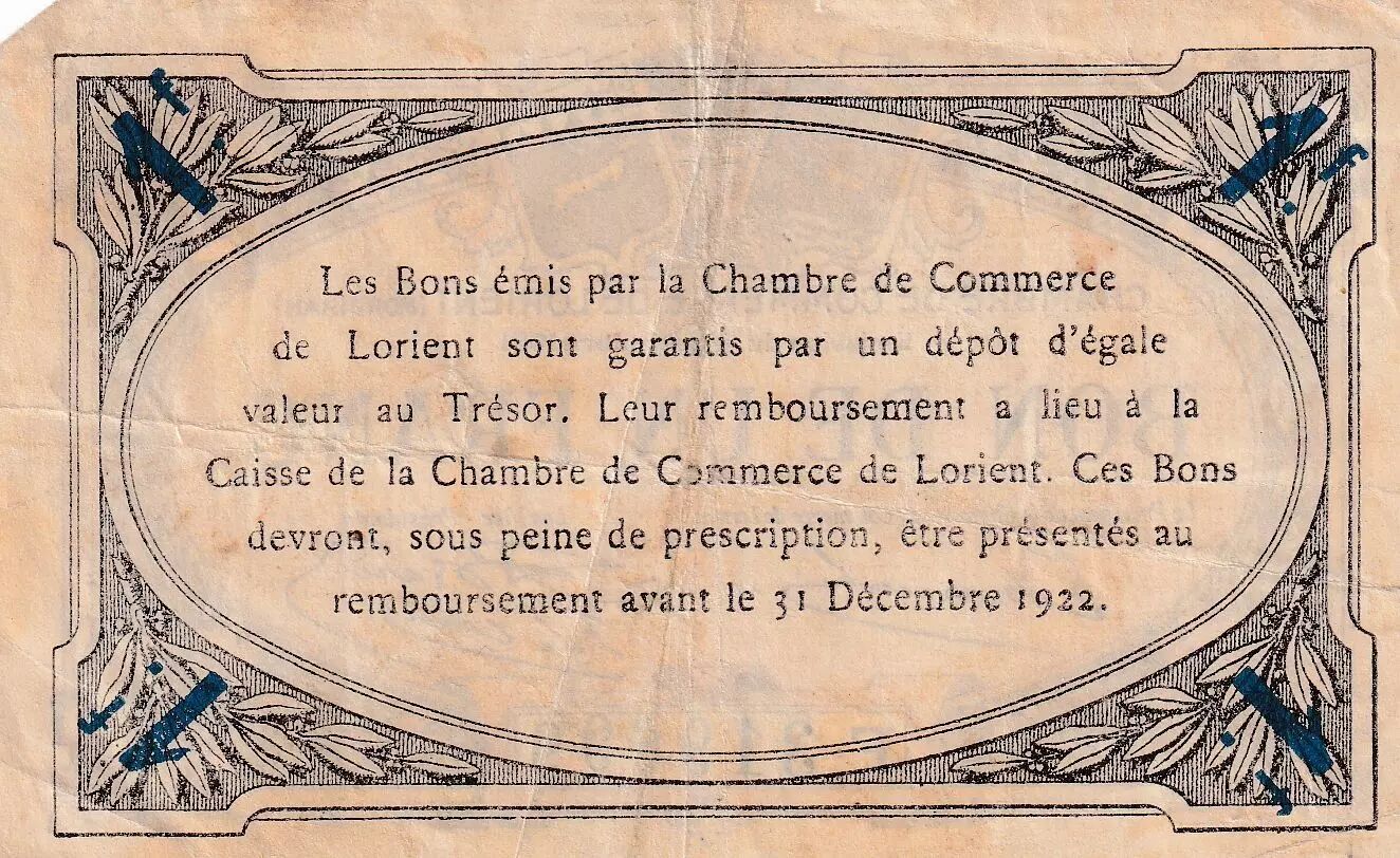 The back of the banknote features a frame with plant motifs. The text specifies that the vouchers issued by the Chamber of Commerce of Lorient will be exchanged for banknotes from the Banque de France in multiples of twenty. It is also indicated that their reimbursement is guaranteed by a deposit of equal value at the Banque de France, in the name of the Chamber of Commerce of Lorient.