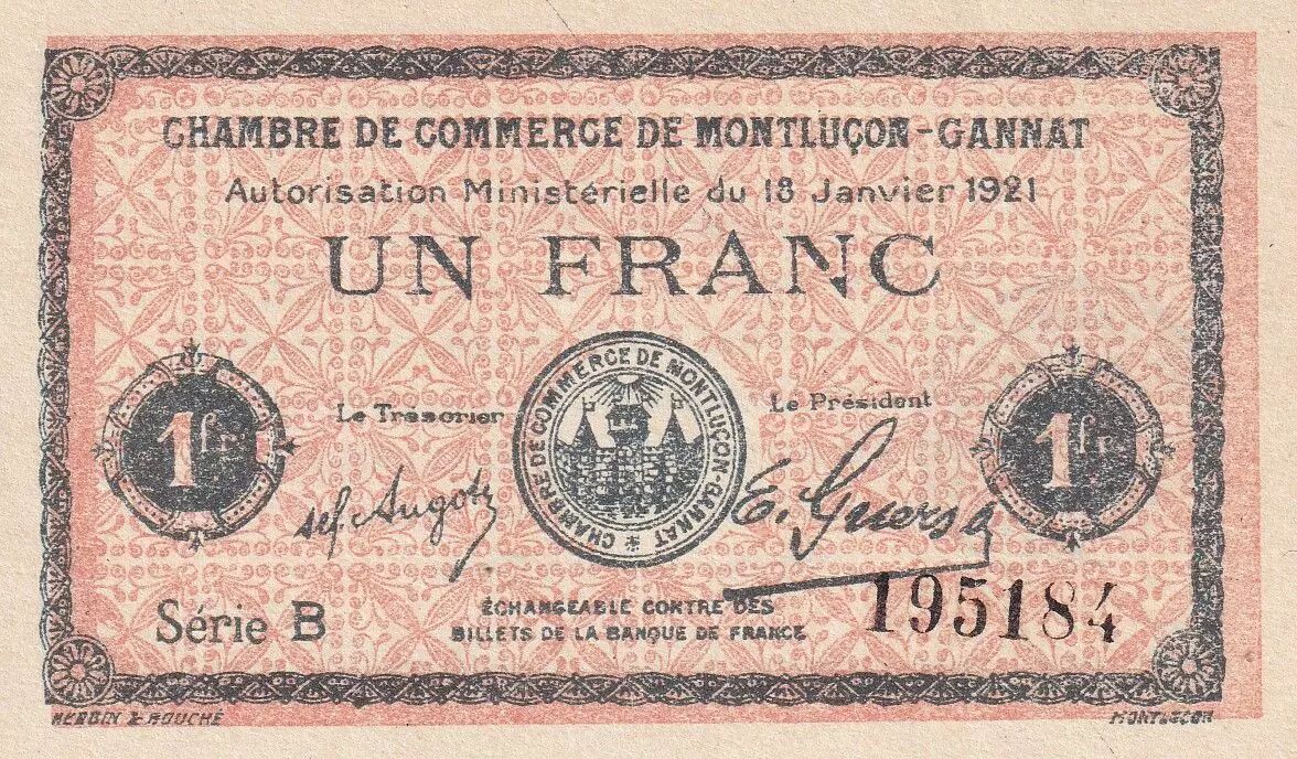 Banknote France 1 Franc - Chambre de commerce de Montluçon-Gannat - Serial B - P.84-58