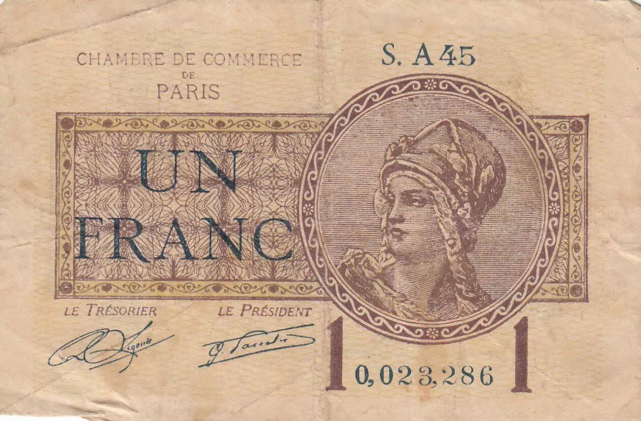 Accueil > Billets Français > Billets de Nécessités (1789-1945) > 1914-1925 Chambre de Commerce > France 1 Franc - Chambre de Commerce de Paris - 1919-1922 - TB - Série A.45
