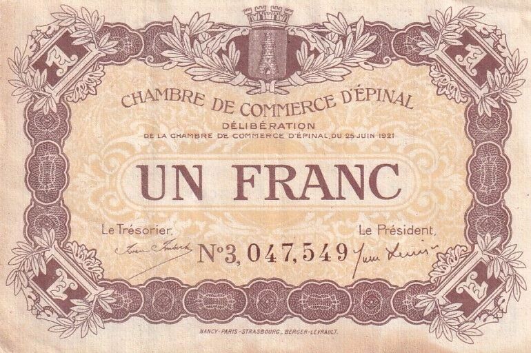 The 1 franc banknote issued by the Épinal Chamber of Commerce, dated June 25, 1921, is a testimony to the local French monetary emissions of the time. This banknote features iconography and inscriptions specific to the issuing institution.