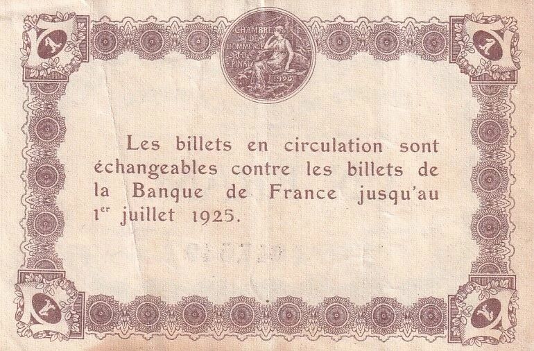 The reverse of the banknote displays the value "1" repeated on either side of a central cartouche. In this cartouche, we find the name of the institution "CHAMBRE DE COMMERCE D?ÉPINAL" as well as the year of issue "1920". An important note specifies that the banknotes in circulation are exchangeable for banknotes of the Banque de France until July 1, 1923. The value "1" is again visible on each side of this cartouche.