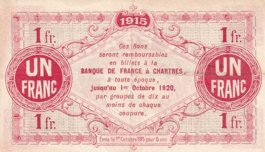 Ce billet de 1 Franc a été émis par la Chambre de Commerce d'Eure-et-Loir en 1915. Il s'agit d'une émission de nécessité, mise en place durant la Première Guerre Mondiale pour pallier le manque de liquidités.